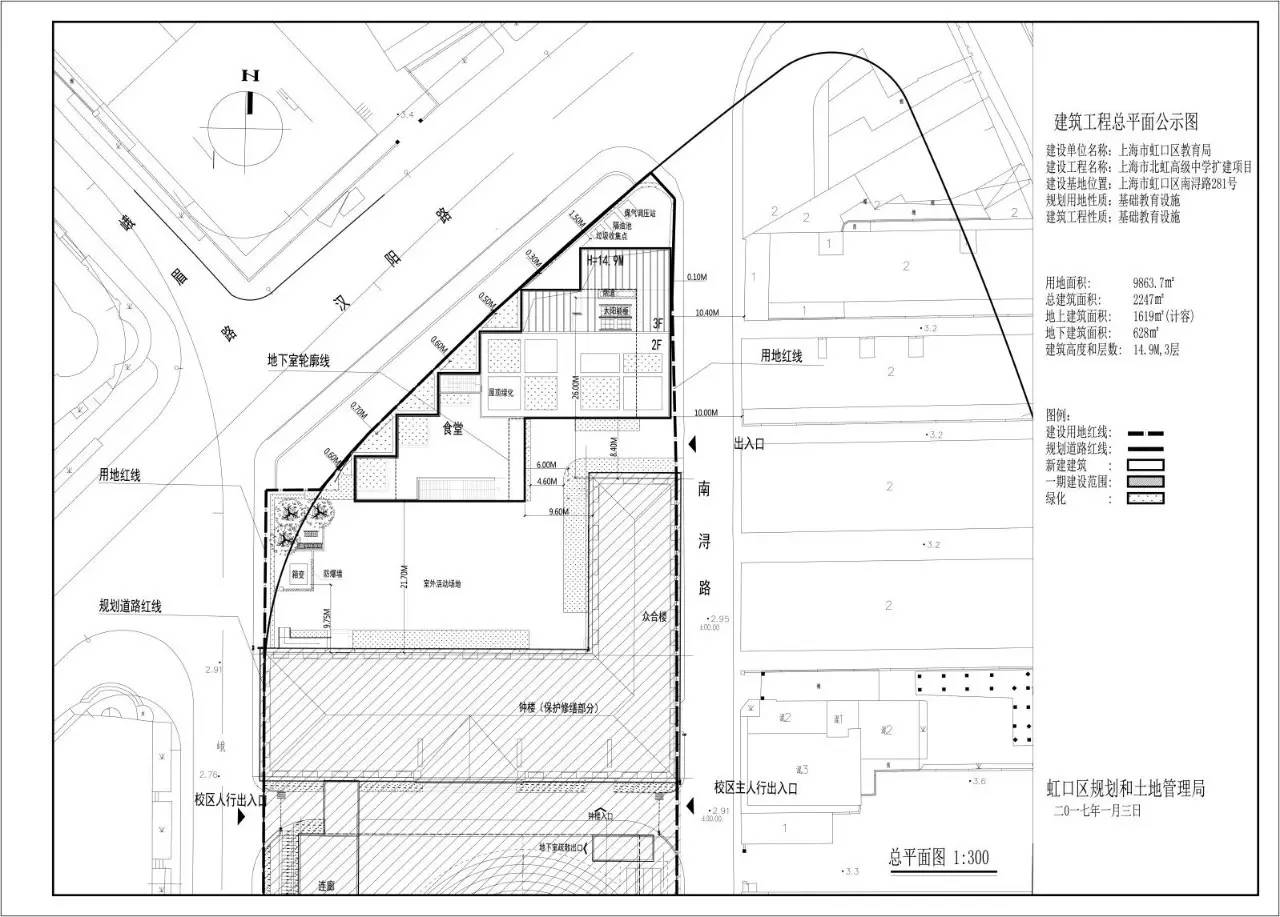 本次項(xiàng)目為北虹高級(jí)中學(xué)改擴(kuò)建辦公樓,位于上海市南潯路281號(hào)。用地面積:9863.7平方米,建筑面積:2247平方米,其中地上1619平方米(全計(jì)容)、地下628平方米,建筑高度、層數(shù):14.9米、3層。